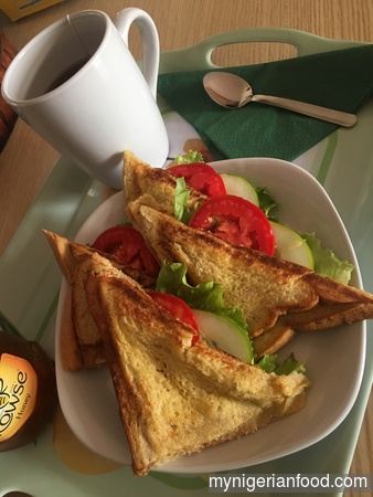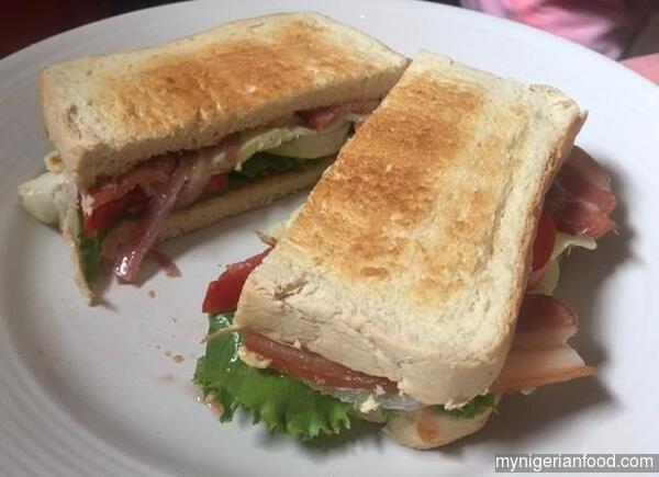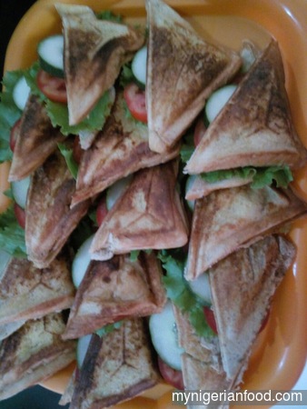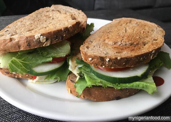 - Partly open up the sandwich and place 1 lettuce leaf, 1 slice of tomato and 1 slice of cucumber