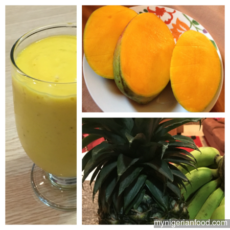 - Add all the fruits, milk and ice into a smoothie maker and blend into a smooth paste