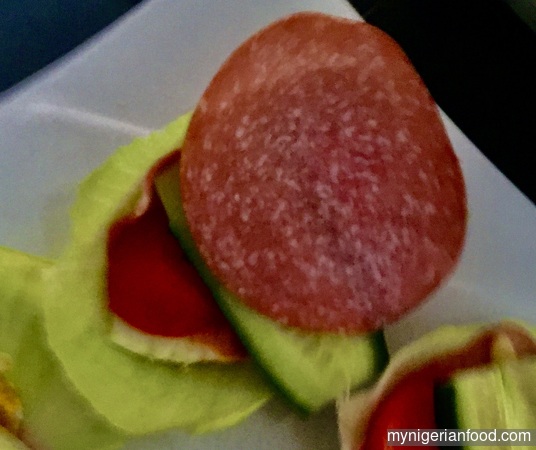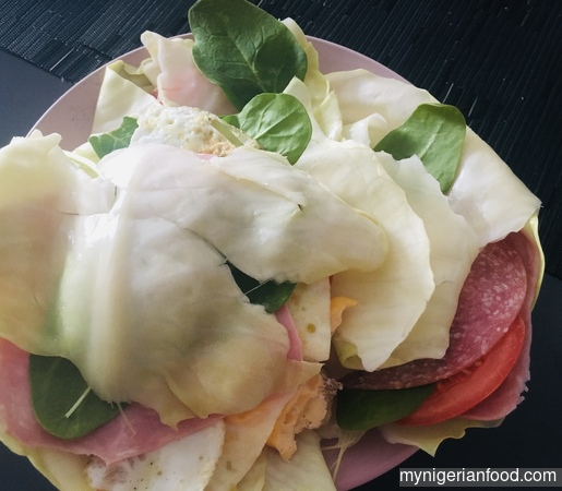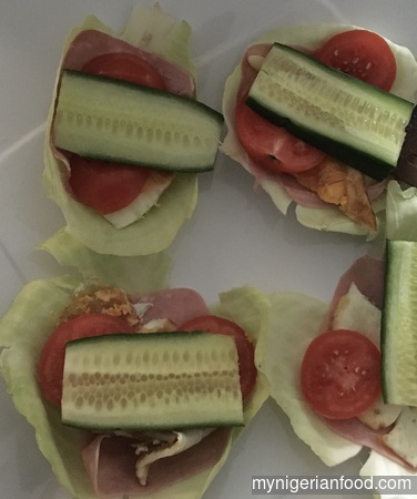 - Lay the Salami, tomatoes, fried egg, cucumber, ham and 3 spinach leaves