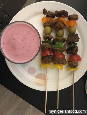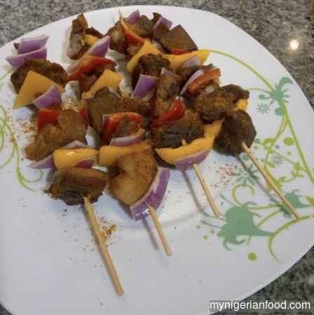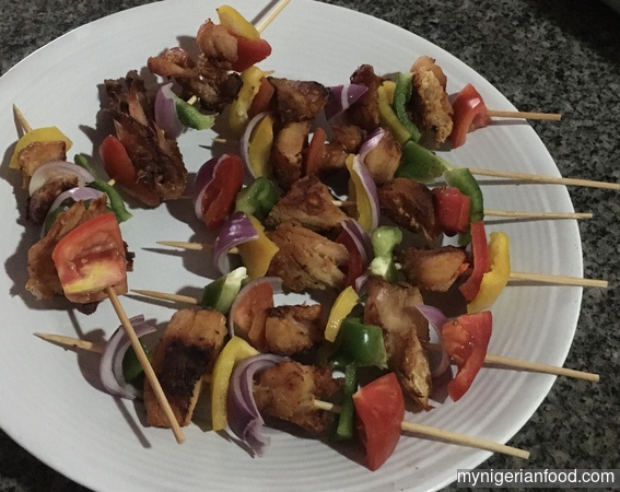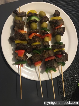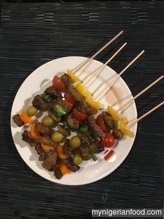 - Take the kebab sticks or skewers and stick the meat alternating with the vegetables to make it colourful