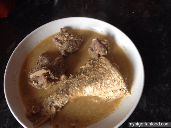 - Add the cooked goat meat and the meat stock as well as the marinated fresh fish into the mixture and allow to cook for about 30 minutes stirring the liquid only with a wooden spatula to prevent it from burning
