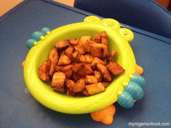 - When the oil is hot, add the plantain and reduce the heat